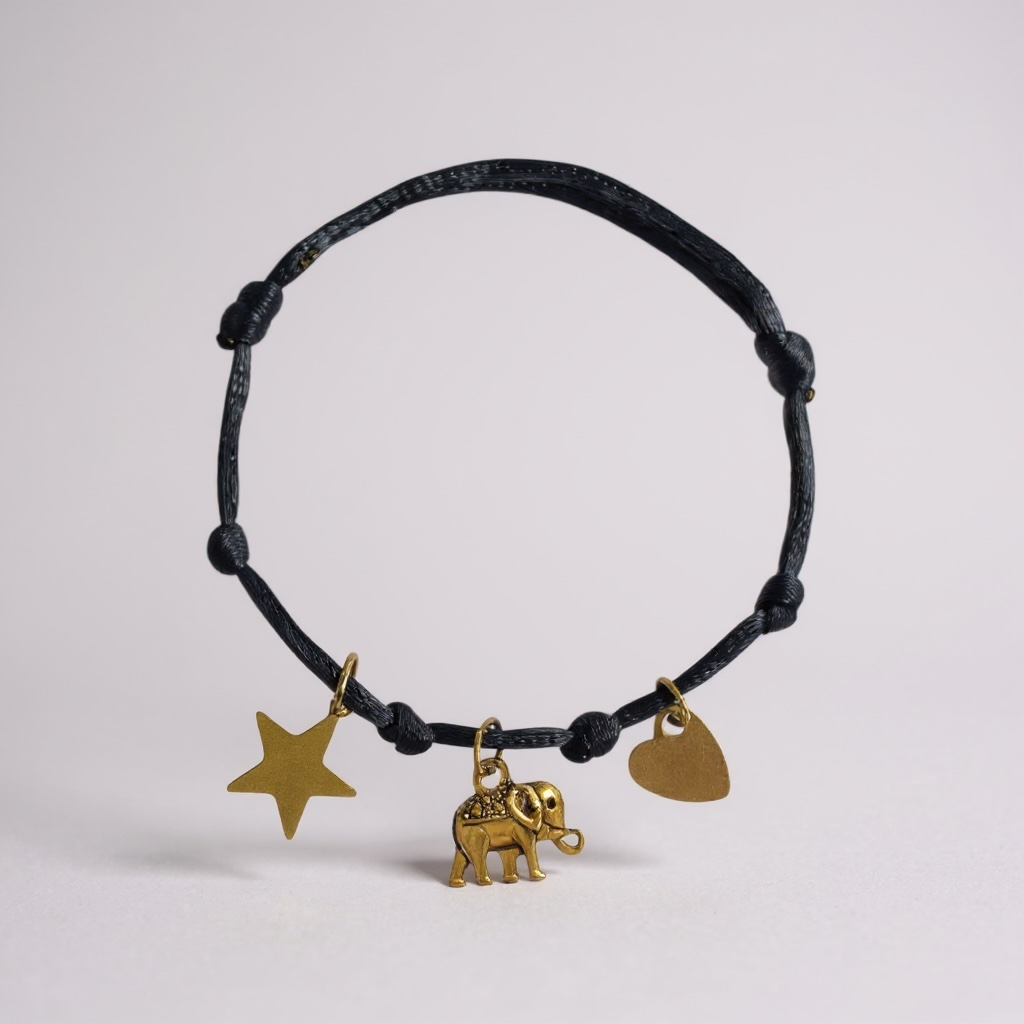 Soutenez les pensionnaires du refuge en portant à votre poignet ce bracelet cordon orné de 3 breloques dont celle symbolisant Rajendra pensionnaire du refuge.