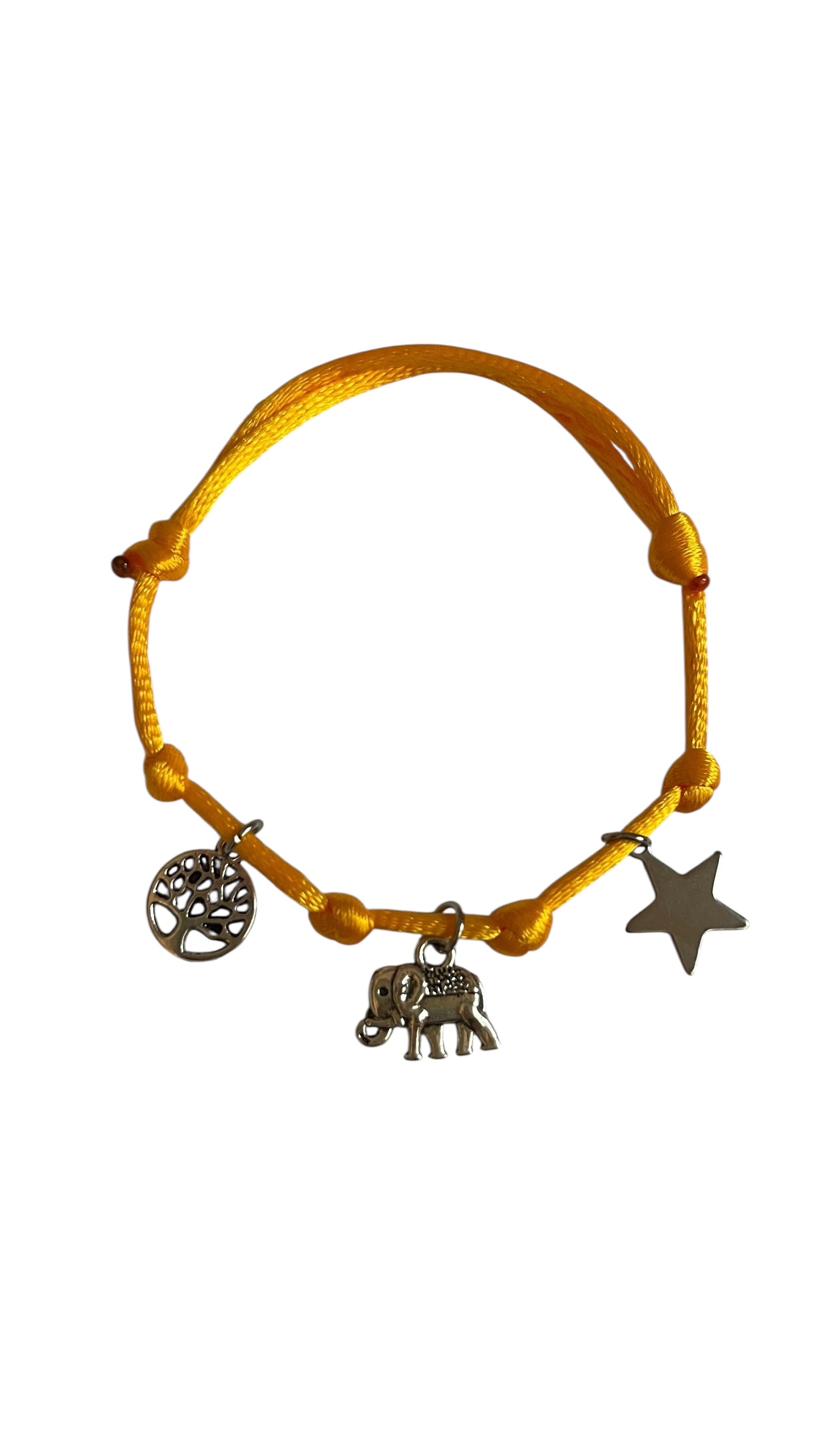 Soutenez les pensionnaires du refuge en portant à votre poignet ce bracelet cordon orné de 3 breloques dont celle symbolisant Rajendra pensionnaire du refuge.