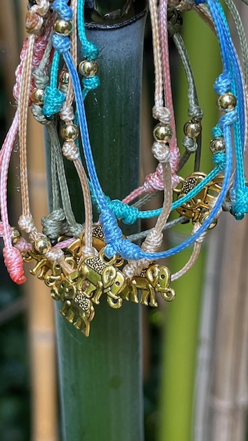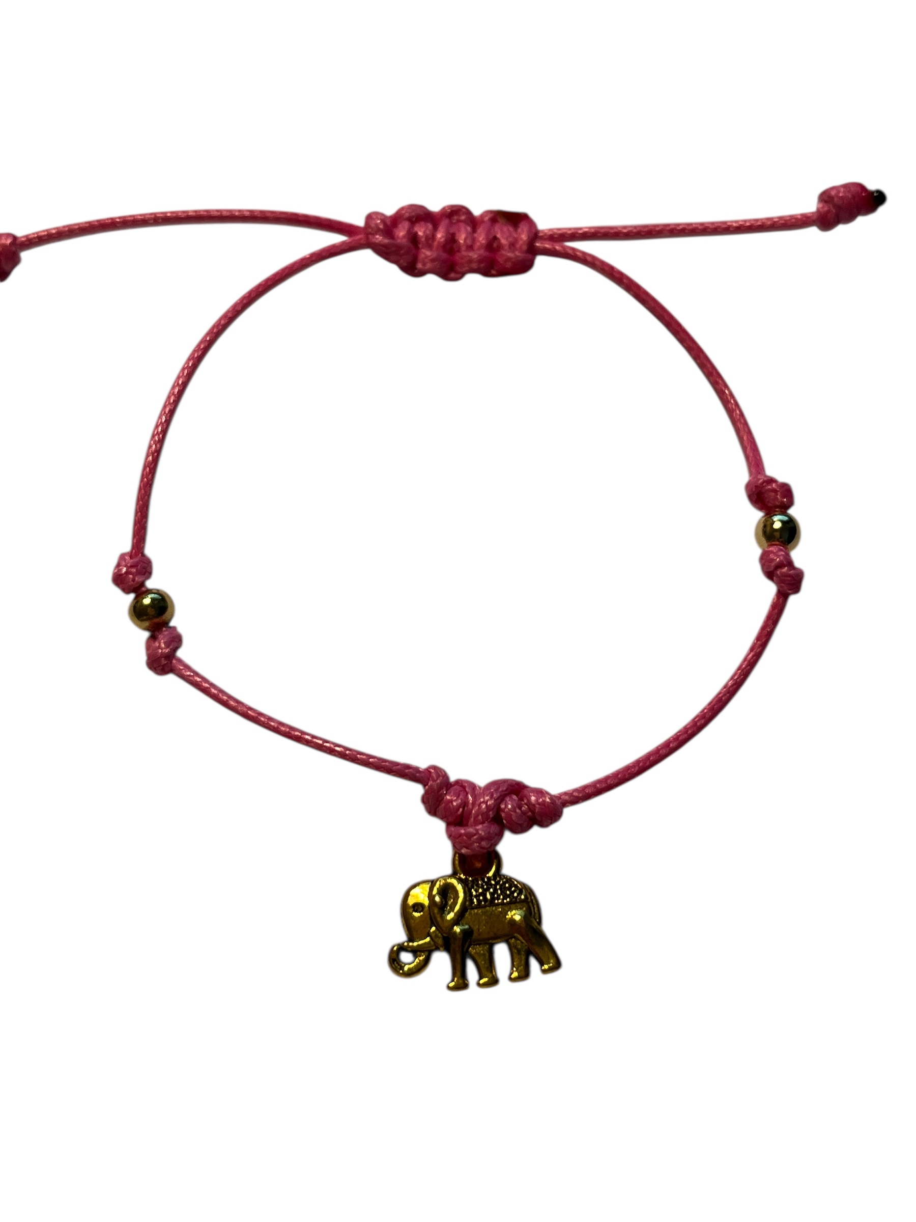 Bracelet cordon réglable et breloque éléphant en métal doré.