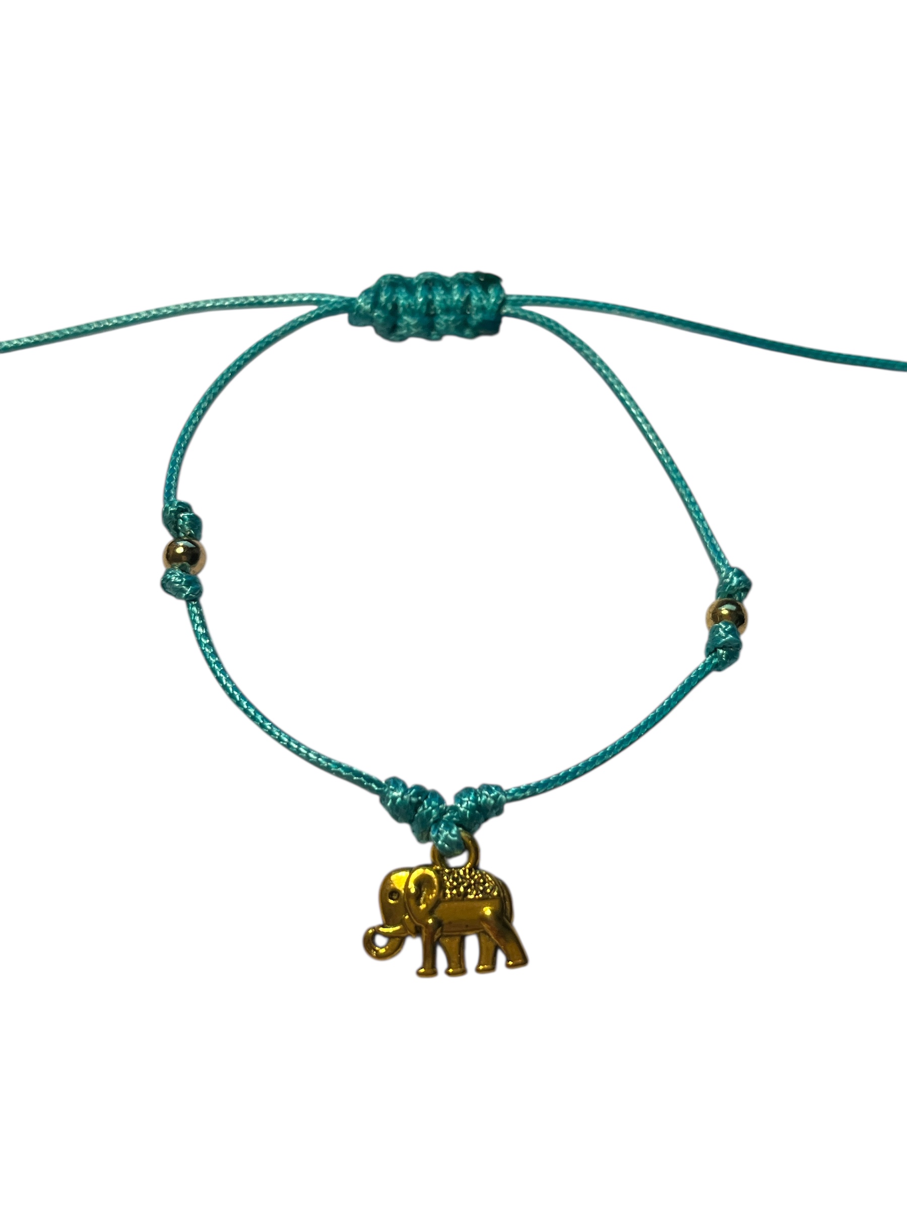 Bracelet cordon réglable et éléphant en métal doré.