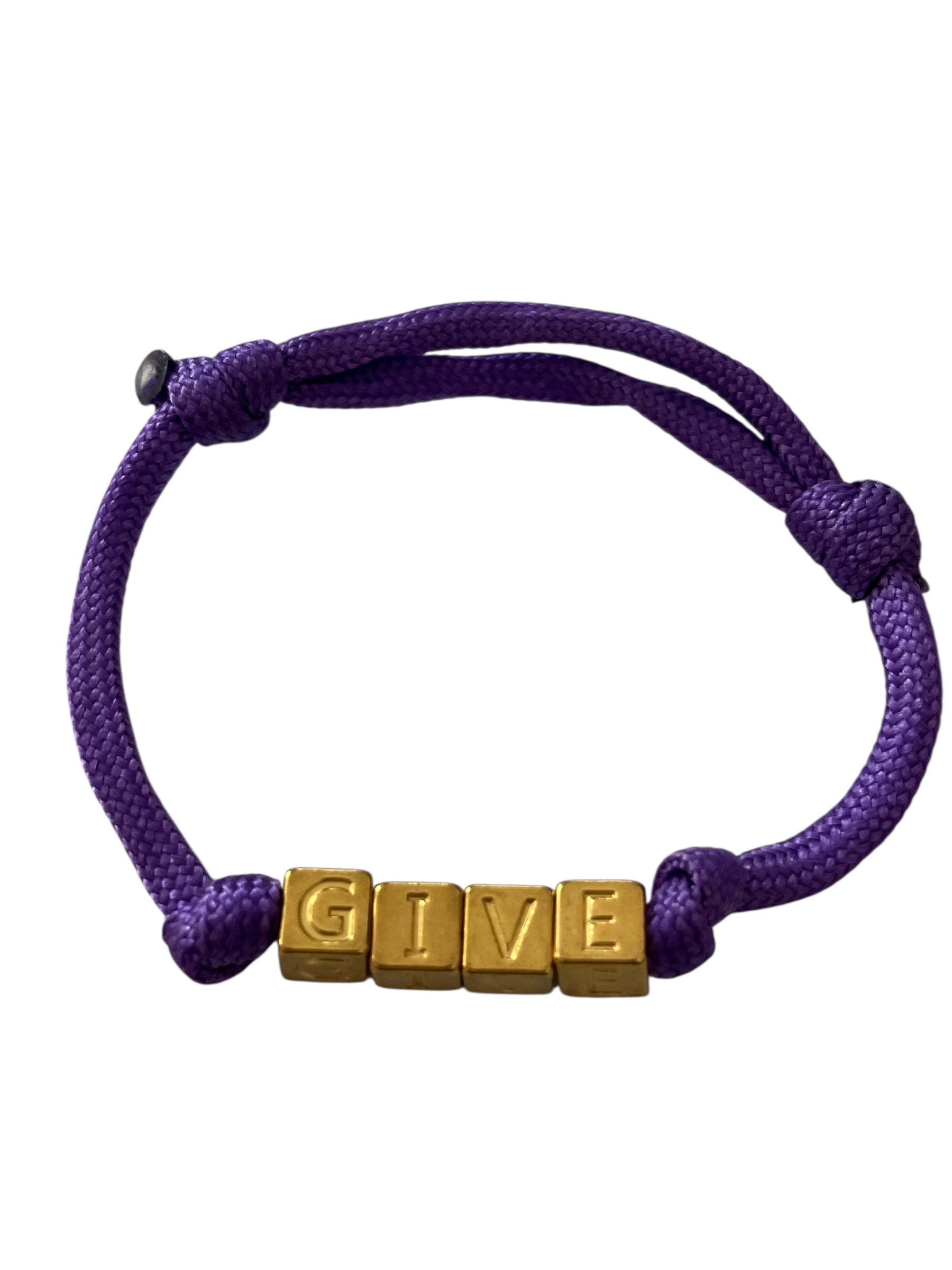 Bracelet sur cordon réglable violet avec lettres cubiques dorées.