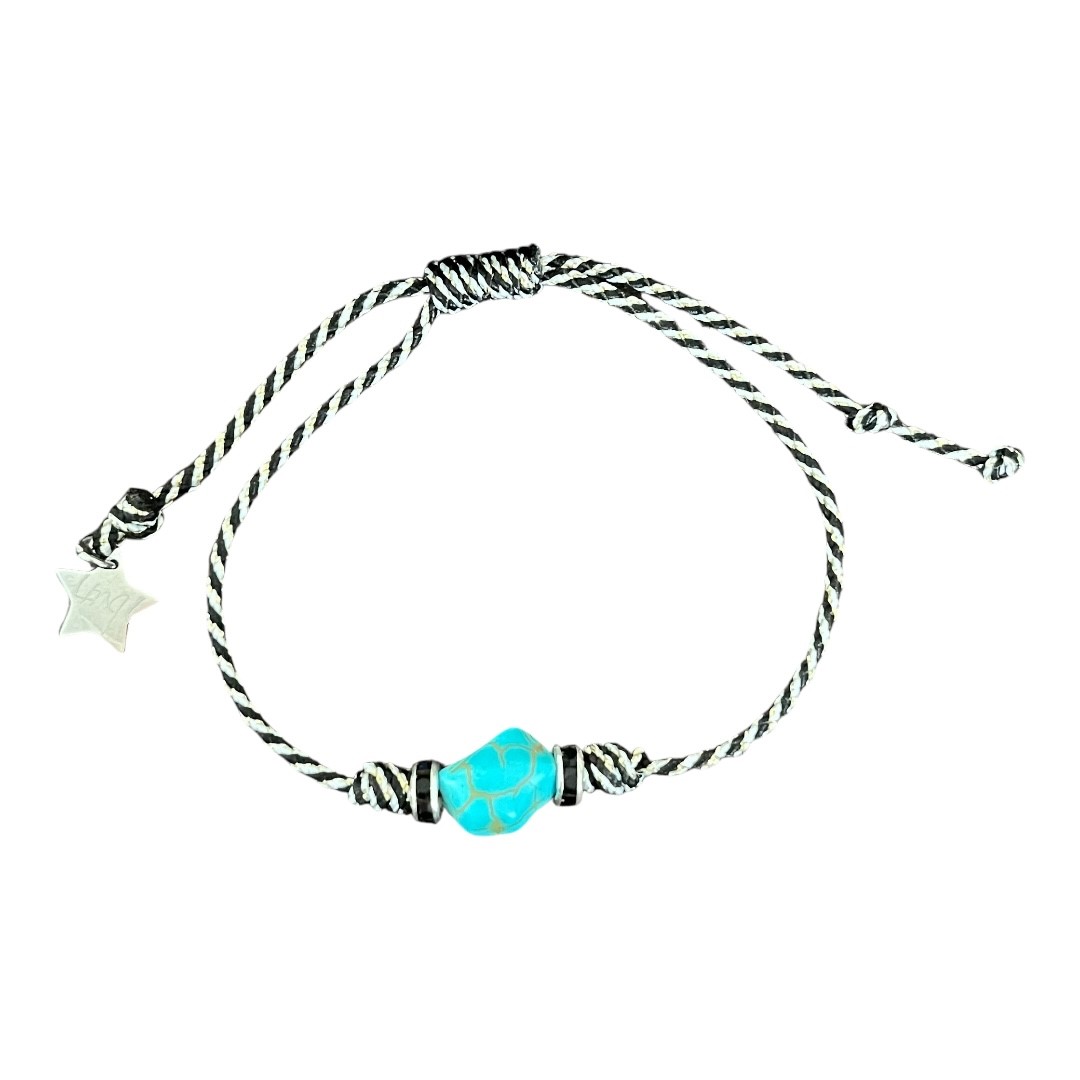 Bracelet réglable sur fil rayé noir et lurex, finition sur un coté avec une étoile acier argent, pierre turquoise entourée de deux rondelles avec oxyde de zirconium noir.