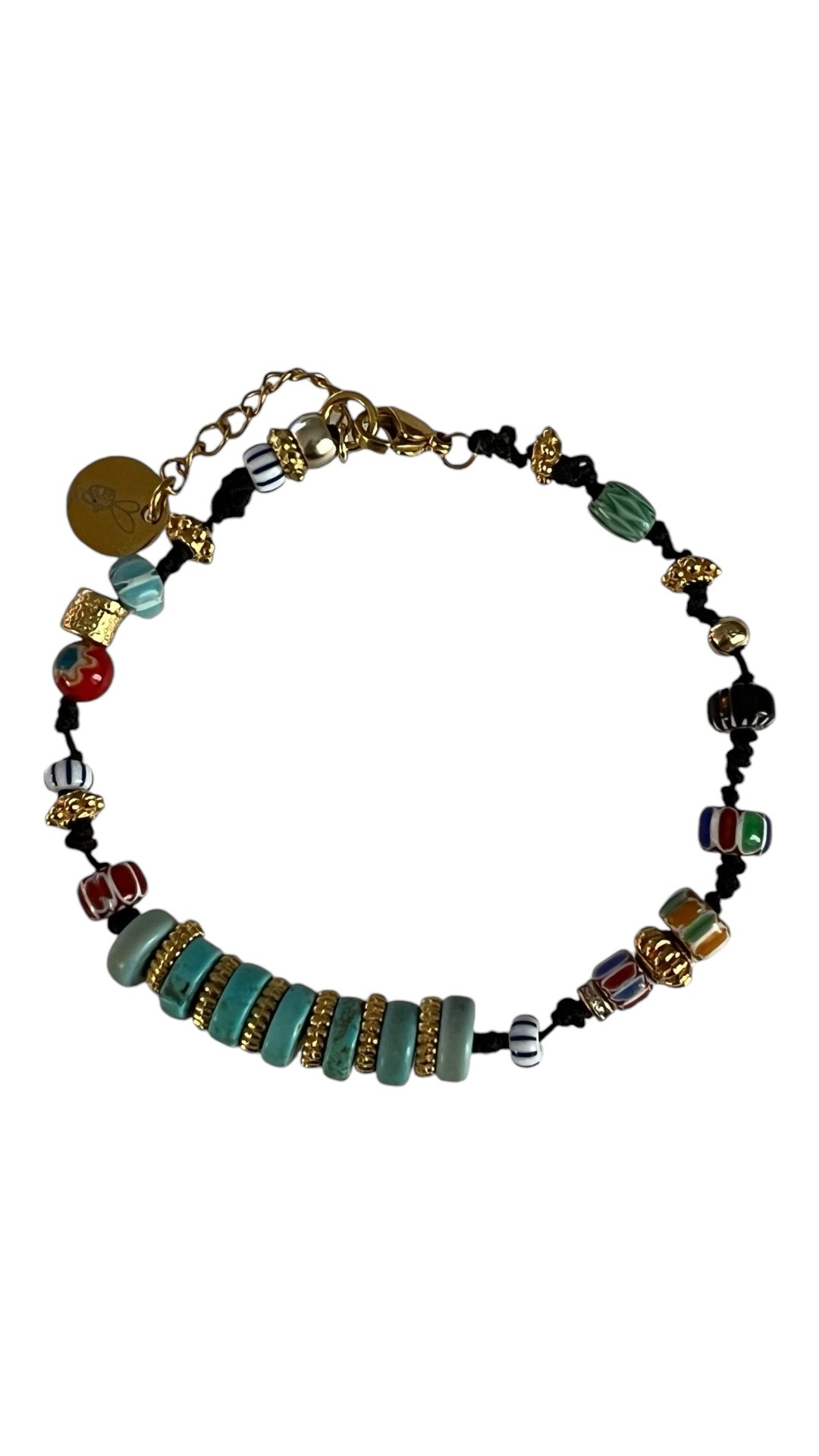 Bracelet avec rondelles imitations turquoise, et perles multicolores. composants dorés acier et gold filled 14k.