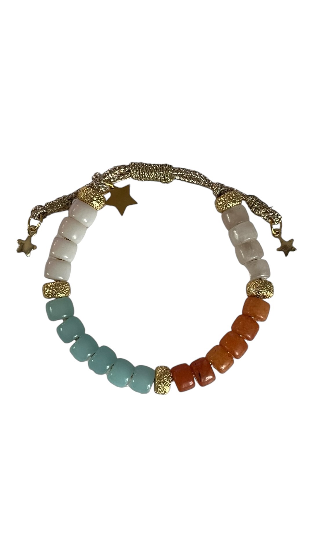 Bracelet réglable sur fil lurex doré, breloques étoiles acier, perles rondelles en verre avec rondelles diamantées dorées.