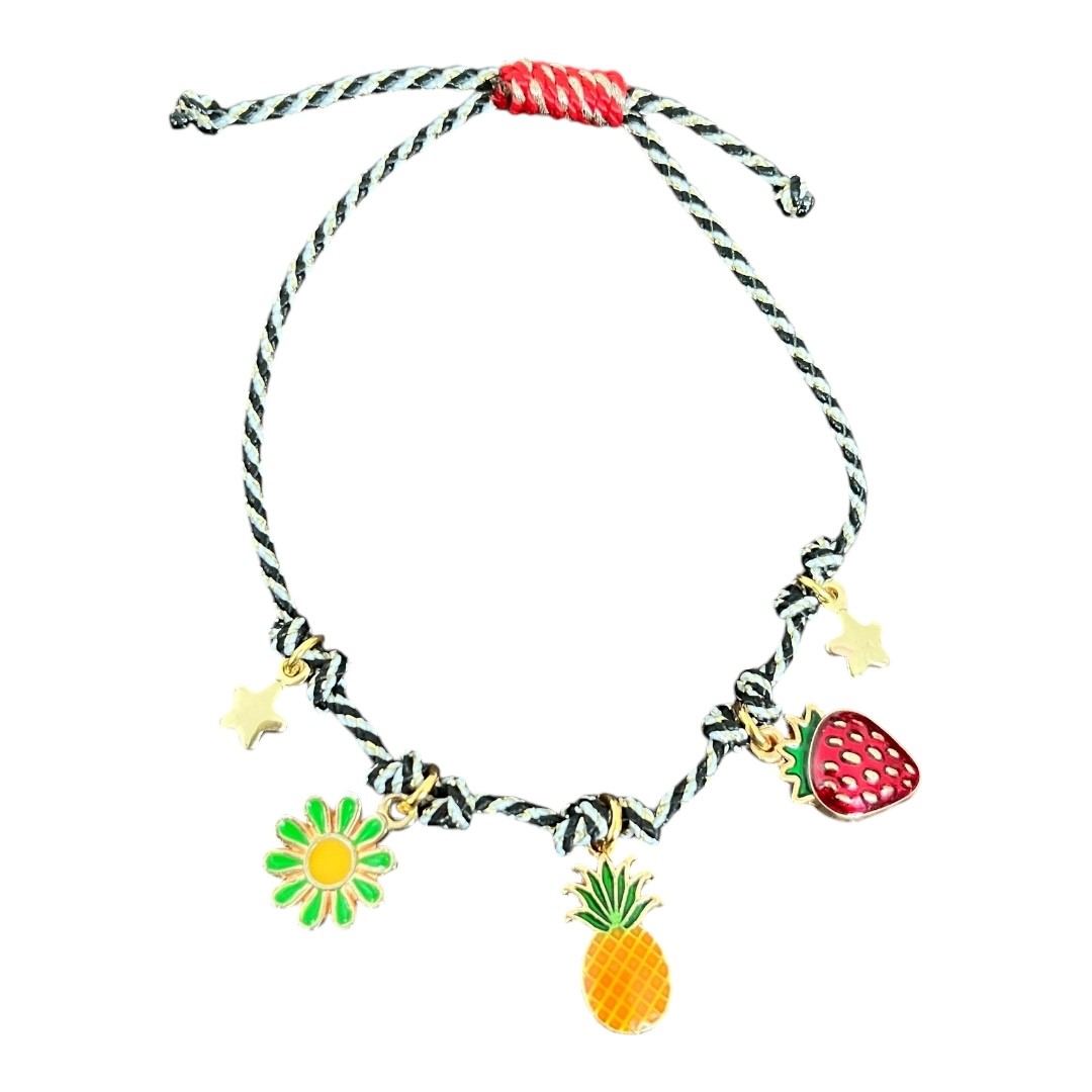 Bracelet réglable sur fil rayé noir et lurex, breloques émail et acier doré.