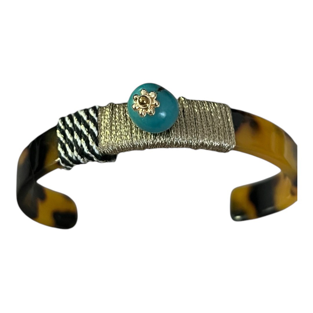 Bracelet écaille orné d’une perle turquoise acai du Brésil et fil lurex et rayé.