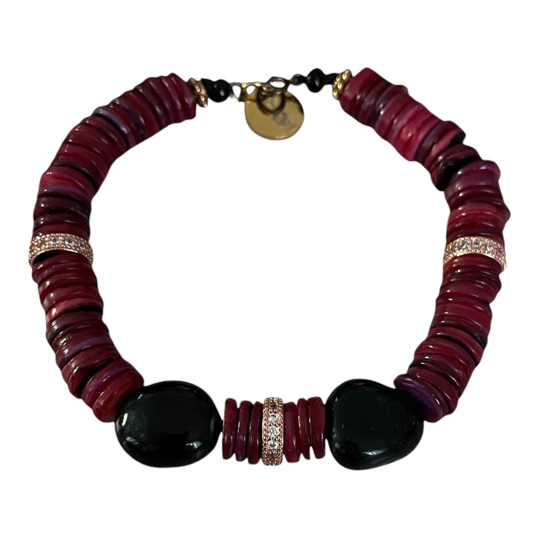 Bracelet avec perles rondelles corail, rondelles oxyde de zirconium et pierres noires naturelles, fermoir gold filled 14k.