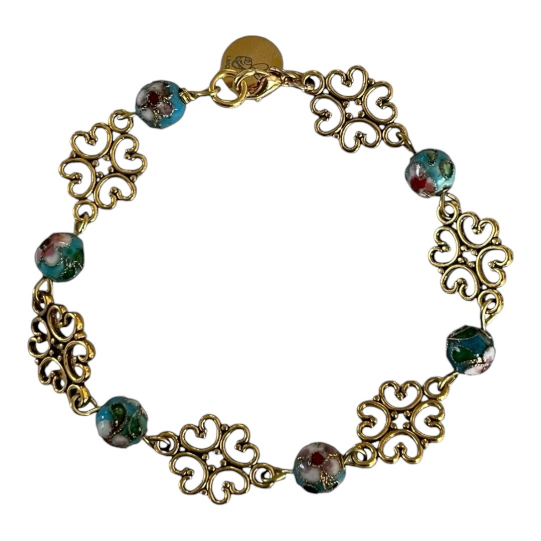 Bracelet pièces filigranes dorées et perles relief fleurs. Fermoir gold filled 14k.
