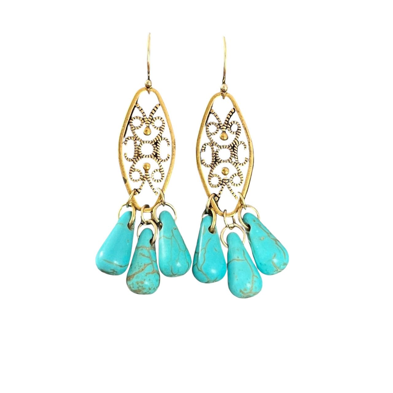 Boucles d’oreilles filigranes dorées et perles gouttes turquoises. Crochets d’oreilles gold filled 14k