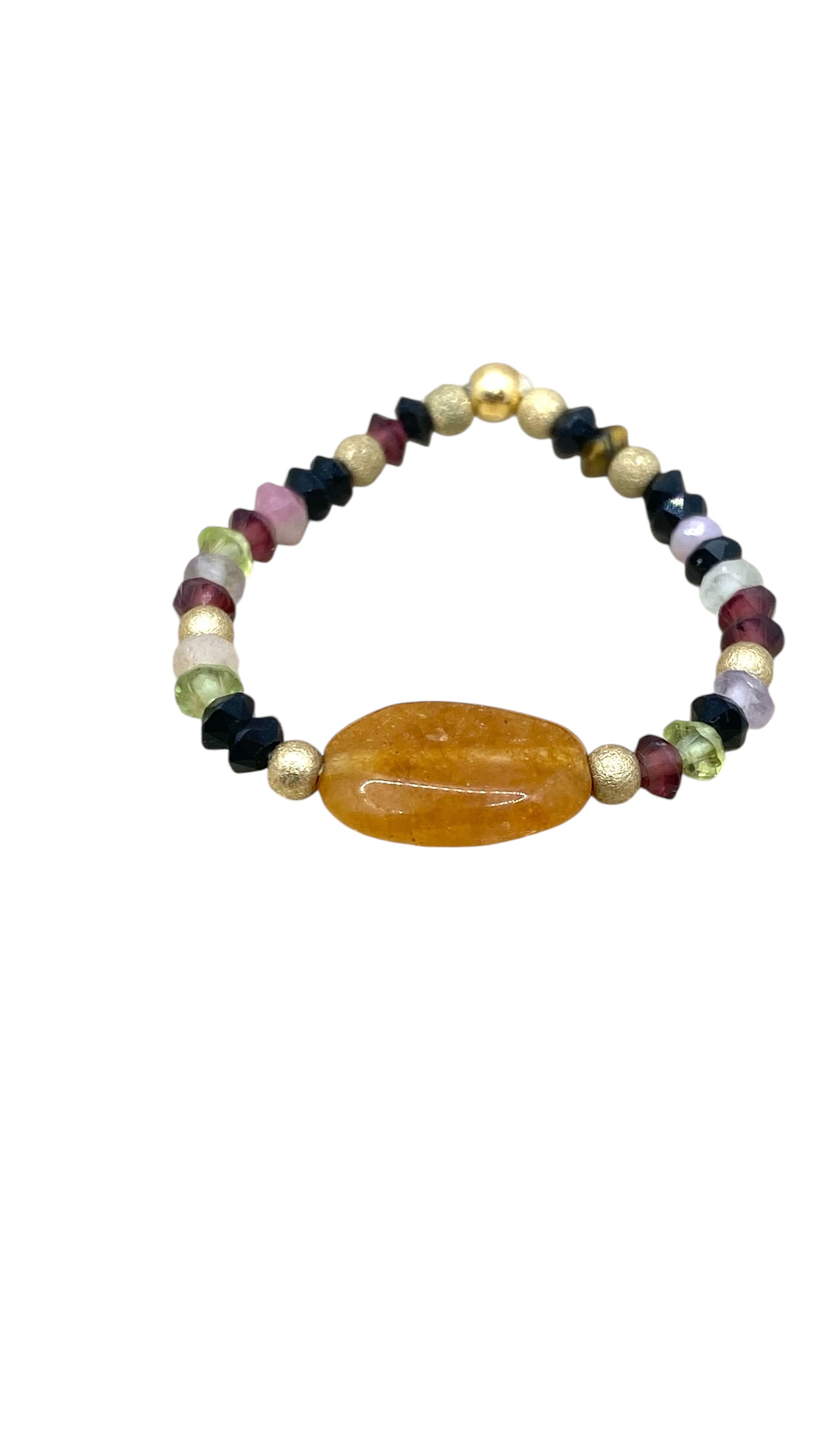 Bague élastique avec perles toupies facetées naturelles (tourmaline, améthyst, péridot…), pierre ovale cornaline