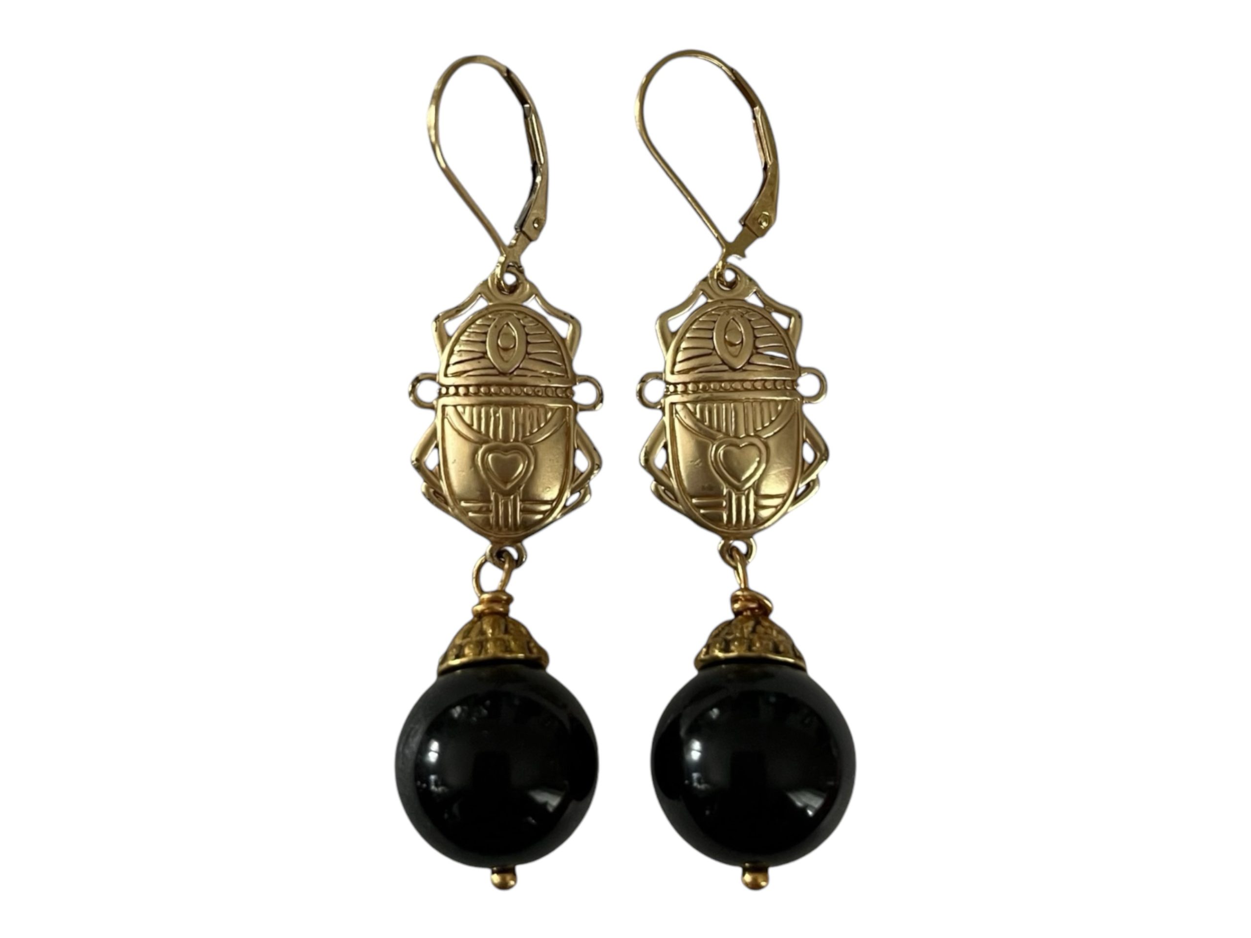 IDAYU earrings sont en onyx, avec un scarabée doré, gold filled 14k.